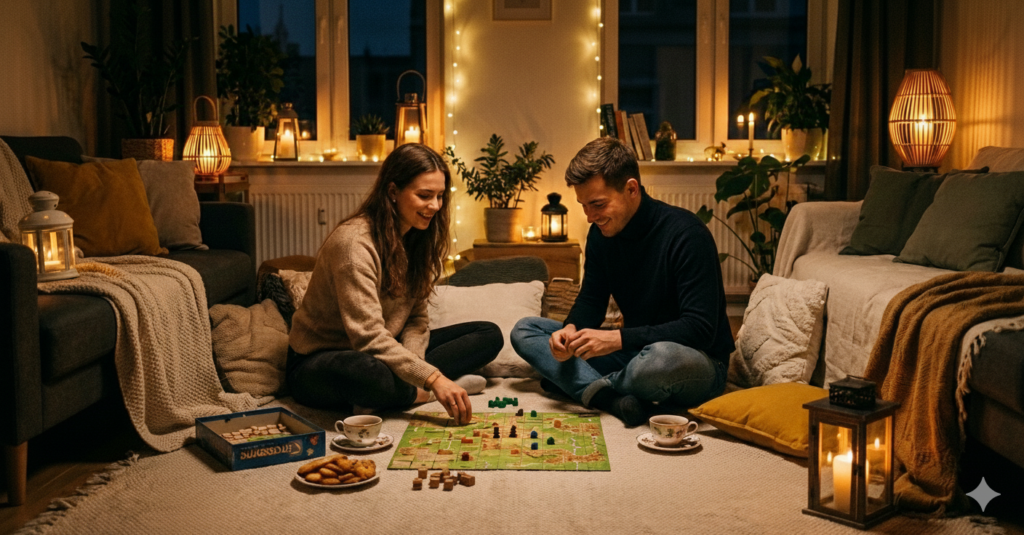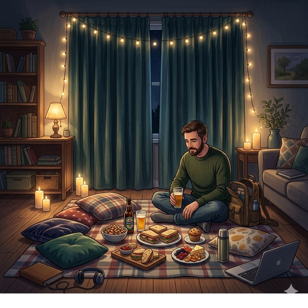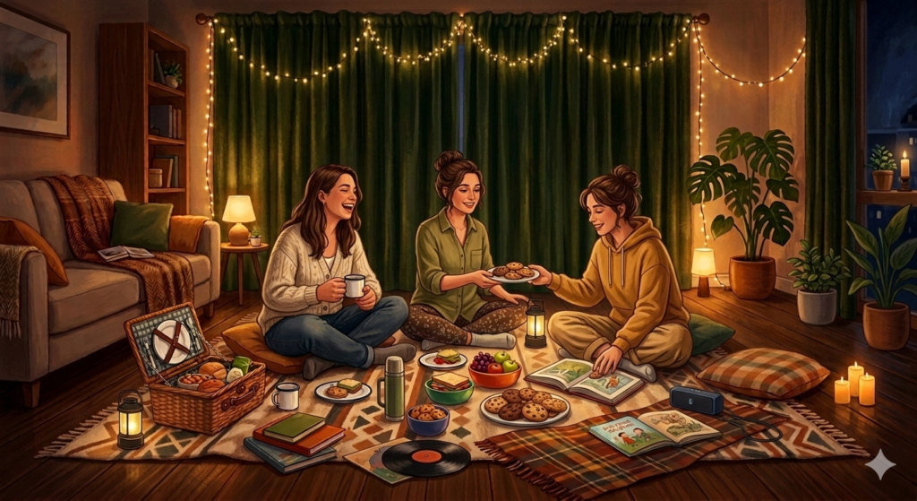 ✔ Koc lub pled rozłożony na podłodze ✔ Ewentualnie poduszki i rośliny doniczkowe dla klimatu ✔ Lampki lub świeczki dla nastroju ✔ Proste przekąski i sałatki w słoikach ✔ Napój rozgrzewający (herbata, kakao, grzaniec bezalkoholowy) ✔ Lekka muzyka lub dźwięki natury w tle ✔ Towarzystwo (lub dobra książka w przypadku samotnego piknikowania).